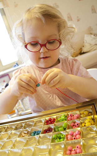 - Kasutada nööri, millele on lükitud erksavärvilised pallid, näiteks punane, roosa, kollane, sinine, roheline. Õpetada silmadega koos vaatamist ühelt pallilt teisele.