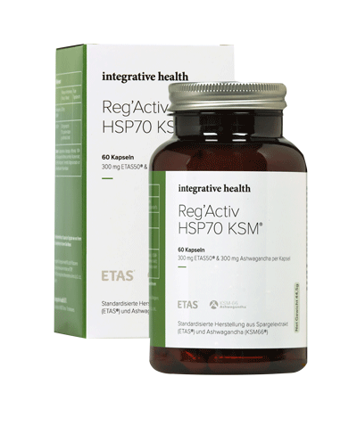 Teaduslikud uuringud on näidanud ETAS® võimet rakus esile kutsuda stressireaktsiooniga valkude (soojusšoki valgud) ekspressiooni. Ashwagandha (Withania somnifera) on India traditsioonilise meditsiini Ayurveda lipulaev. Sajandeid tuntud Ashwagandha on adaptogeenne ravimtaim, mis soodustab organismi tasakaalu. Reg’Activ Hsp70 KSM® aitab teie kehal toime tulla stressirohke igapäevaeluga.